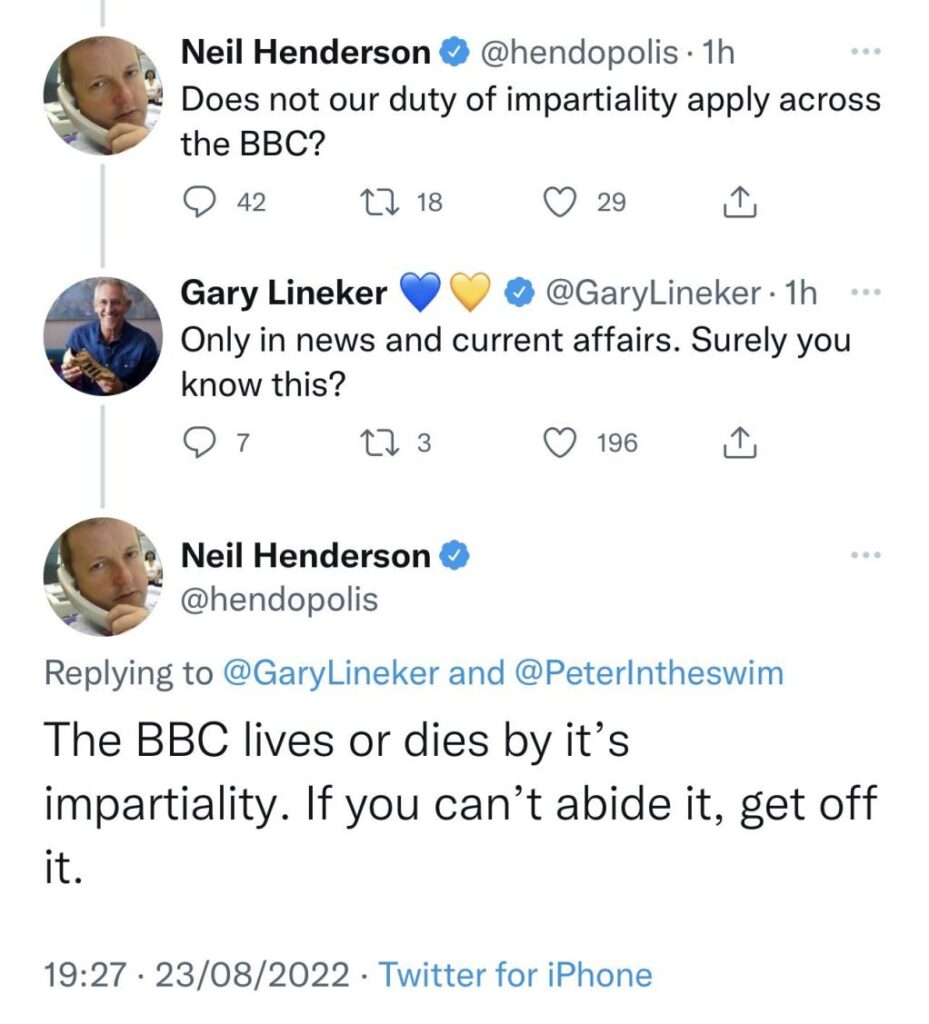 “Do you have the freedom to tweet about this sort of thing because you have a different contract to mine? Because if so I’d be sacked,” Henderson wrote. “Does our duty of impartiality apply across the BBC?”