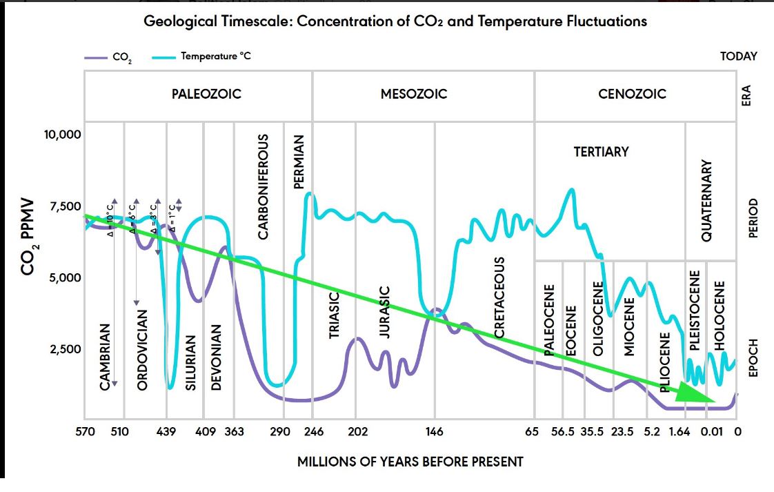 Here’s what things look like on a really long geological scale…showing NO link between CO2 and temperature; indeed, the Eemian was two or three degrees C warmer than now, with far lower CO2; and CO2 concentrations now are at the low end of what preceded for millions of years.