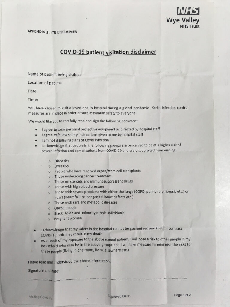 The “patient visitation disclaimer” from Wye Valley NHS Trust (depicted below) also tells the over-65s, pregnant women, diabetics and obese people, among a list of 11 categories, that they are “discouraged from visiting” for safety reasons. It informs the visitor he or she has “chosen to visit a loved one in hospital during a global pandemic”, as though that is something blameable for which he or she should feel ashamed.