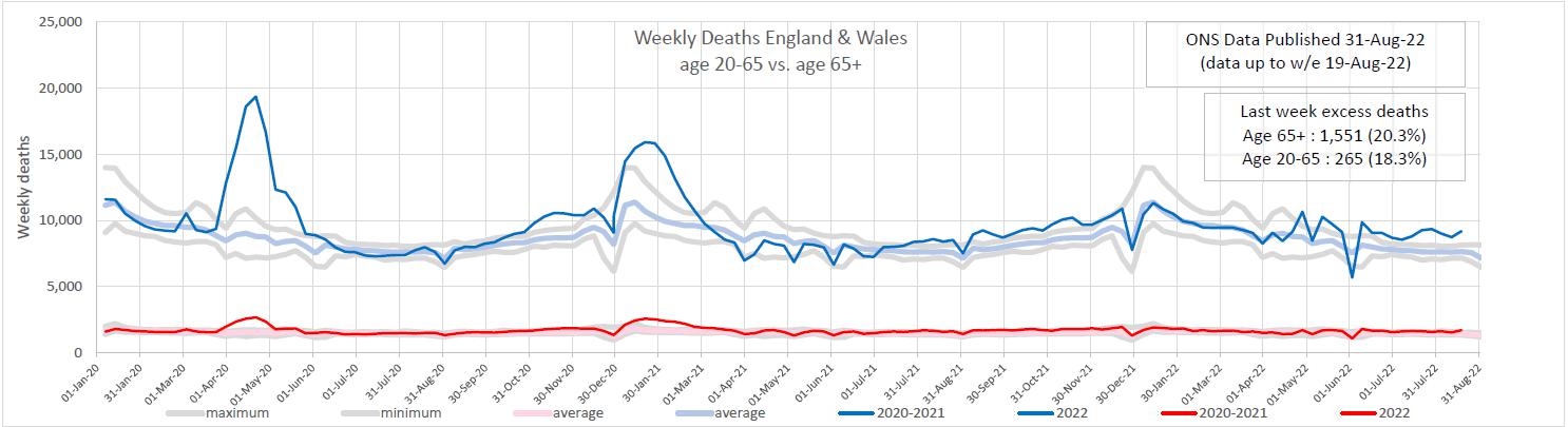 Overall, for the last week of data from ONS (w/e 19 Aug), there are 1,809 excess deaths above the pre-pandemic hoax average. That’s nearly 20%.