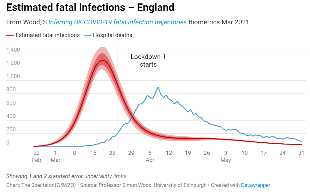 But Cain’s argument here is interesting mainly because it shows that lockdown proponents are still stuck in March 2020 and no amount of contrary evidence will disturb the serenity of their self-congratulation. Cain repeats the discredited claim that “Covid’s exponential growth meant that for every day that decisive action was delayed, the magnitude of the problem would soar”. The Spectator even kindly printed immediately below Cain’s letter this week a letter from Edinburgh mathematician Professor Simon Wood, which sets out once again (as he has numerous times before, including in the Spectator) the clear evidence that new daily infections in England, far from “rising exponentially”, were already falling before lockdown on March 23rd 2020. This crucial point is shown in Professor Wood’s chart below, taken from his peer-reviewed study on the subject. Yet rather than conceding that his entire argument is built on a falsehood, Cain expanded his letter into a full-length article which the Spectator published Thursday morning and which repeats the demonstrably false assertion that lockdown was necessary to address “exponentially rising” infections. Why the Spectator editors have allowed him to publish the unsubstantiated claim (twice) without addressing the contrary evidence, which they have themselves published beneath it on the letters page, is frankly baffling. At what point does this qualify as spreading misinformation?