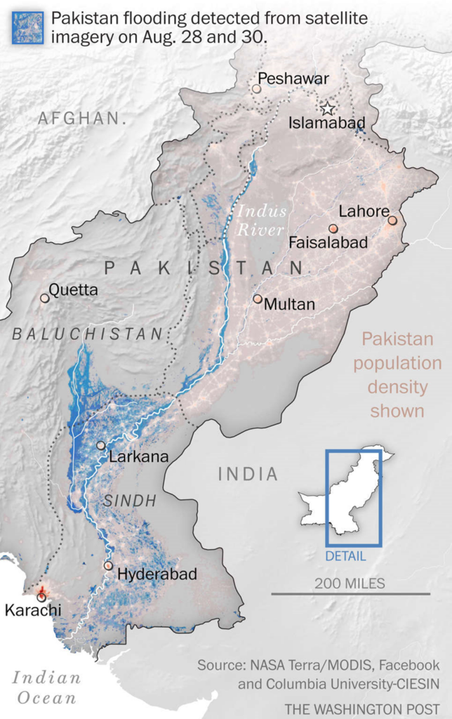 But one third of the land “completely submerged”? Citizen journalist Paul Homewood makes the obvious point – obvious, it might be noted, to those with a basic knowledge of geography – that on the face of it the claim is an “absurd one”. Much of Pakistan is mountainous or desert, and the satellite photo below shows the area flooded is nothing like a third.