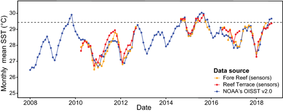 The survey was taken at Palmyra Atoll, where there’s little nearby human habitation, and the reefs examined were in pristine condition. Between 2009 and 2018, a group of researchers from the San Diego-based Scripps Institution of Oceanography took copious records across 80 plots of coral. In 2009 and 2015-16, two natural El Niño events struck suddenly, warming waters by up to 3°C. The graph below plots the changes in temperature at Palmyra.
