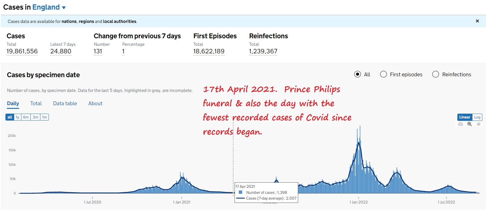 Not a philosophical point but a practical one. Prince Philip’s funeral was on 17th April 2021. This date was also the date of the lowest number of covid infections recorded since records began.