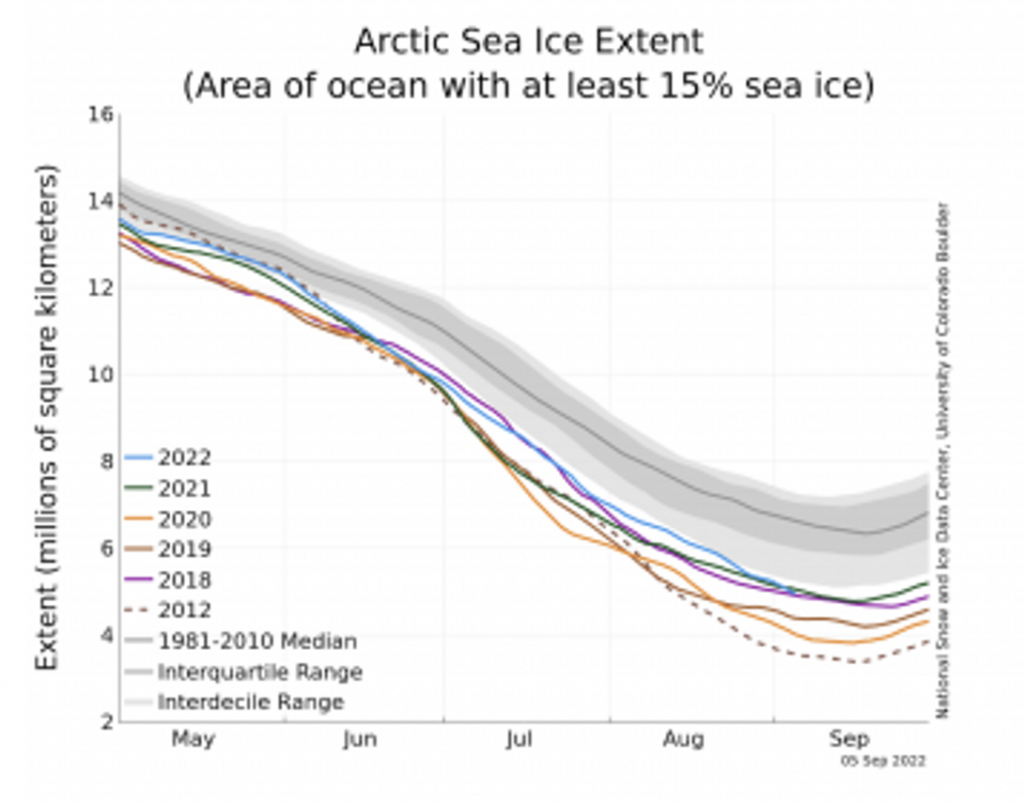 As can be clearly seen, the 2022 blue line is well above the 2012 low point. According to the NSIDC, average sea ice extent for August ranked 13th lowest in the recent satellite record. The growth of Arctic sea ice has been confirmed by a number of sources. The EU weather service Copernicus reported that the coverage of Arctic sea ice is now very close to the 1991-2020 average.