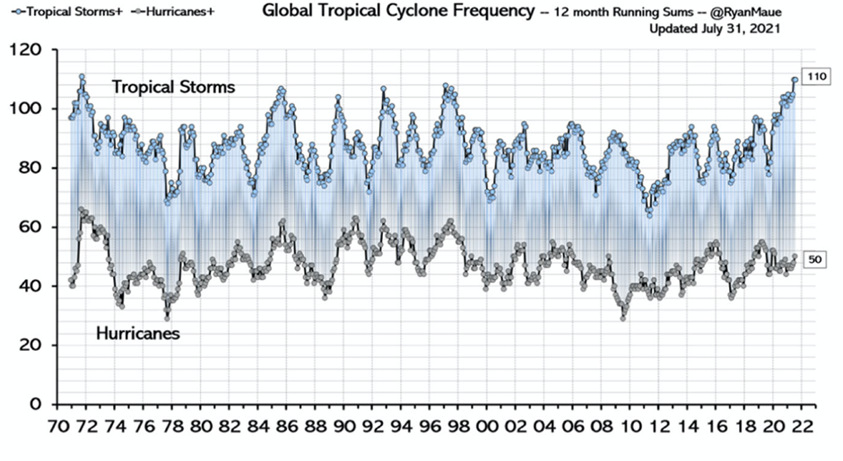 Hurricane and cyclones are favourite subjects for green alarmists. It is unsurprising why they focus on these storms, since the Italian scientists note that historically around 60% of all economic damage caused by global disasters is the consequence of U.S. hurricanes. On May 27th, the Met Office predicted that the 2022 Atlantic hurricane season, which runs from June to November, would “most likely” be above average, with a “likelihood” of 18 named tropical storms including nine hurricanes and four major hurricanes. In fact, the current Atlantic hurricane season has had its slowest start for 30 years. At the end of August there have been no hurricanes, and only three named storms, none of which produced winds of 74mph or higher.