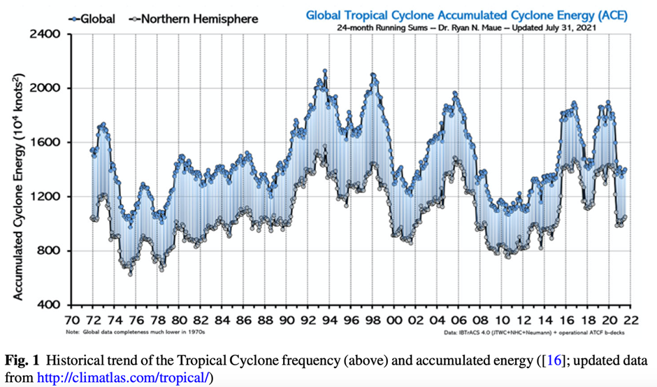 There is plenty of evidence that hurricane and cyclone frequency and intensity has changed little over the recent historical record. “To date, global observations do not show any significant trends in both the number and the energy accumulated by hurricanes,” note the Italian scientists. The two graphs below demonstrate this.