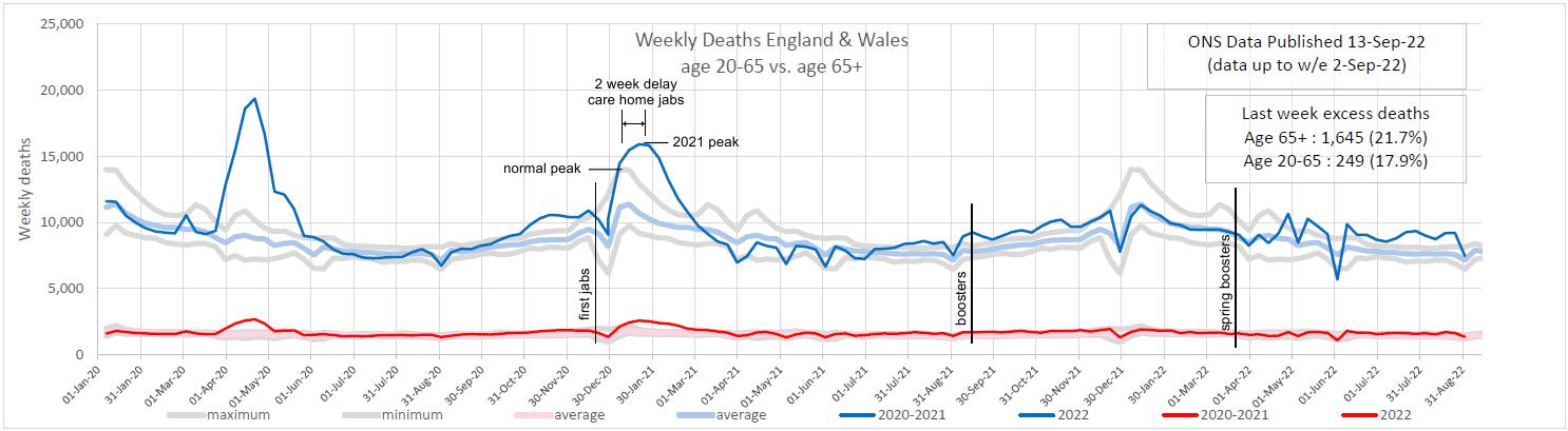 Here’s something on the effect of boosters and jabs in general in the 65+ year olds. I compare weekly deaths working age 20-65 and retired age 65+. On the chart, I have added some jab milestones. (Note that the last point is for a week with a bank holiday and needs to be considered in conjunction with the next week or two).