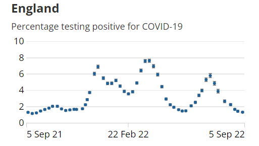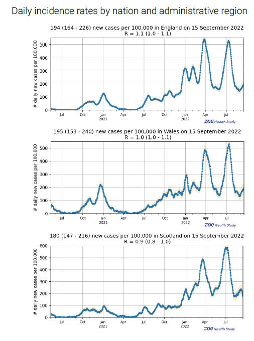 Scottish children returned to school on August 17th, which presumably explains that country’s recent rise. The fact that infections in Scotland already seem to be falling again suggests that the outbreak may be short-lived, possibly owing to the high levels of natural immunity now present in the population and especially in schoolchildren. The UKHSA doesn’t provide data on antibodies-from-infection in under-17s, but the data for other age groups show that over 80% of 17-29 year olds in England have natural immunity, a percentage that is likely to be higher still in under-17s.