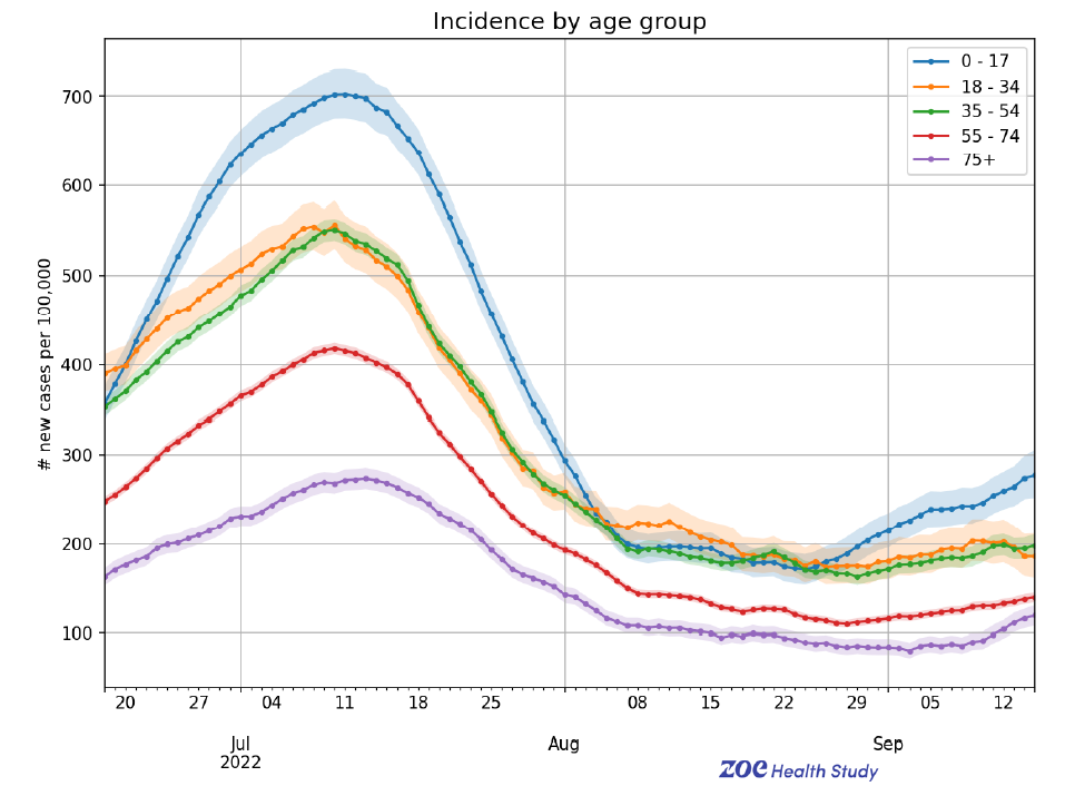 Indeed, these graphs are precisely what one would see for the common cold this time of year (beginning of school year). That is, if cold viruses were ever tested for with anywhere near the same zeal as they do for Covid (which, much like the old coronaviruses that came before it, has basically become the new common cold these days, especially for kids).