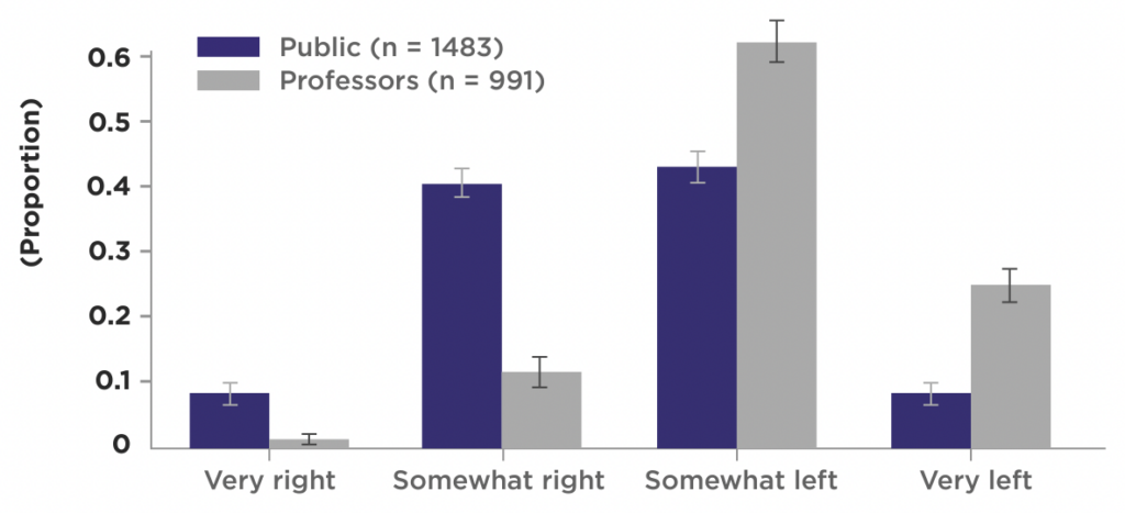 Christopher Dummitt and Zachary Patterson – two researchers from the Macdonald-Laurier Institute – surveyed around 1,000 Canadian academics, along with a representative sample of Canada’s population. Their main finding is shown in the chart below.
