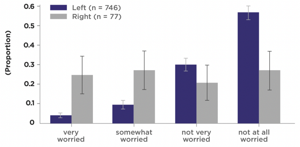 Only around 15% of left-wing academics said they were “somewhat” or “very worried”. By contrast, around 50% of right-wing academics said the same. In other words, around half of right-wing academics worry about expressing their opinions on “diversity” for fear that doing so might land them in trouble. But most left-wing academics don’t – presumably because they hold the “right” opinions.