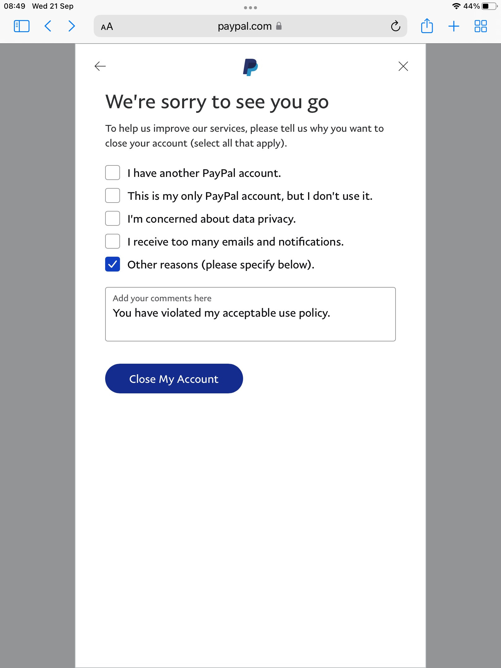 I contacted customer services and asked what I’d done, exactly, on my personal account that ran afoul of PayPal’s Acceptable Use Policy. I’ve had it since 2013 and use it, at most, four times a year, usually to receive money from a Swiss weekly magazine I occasionally write for.