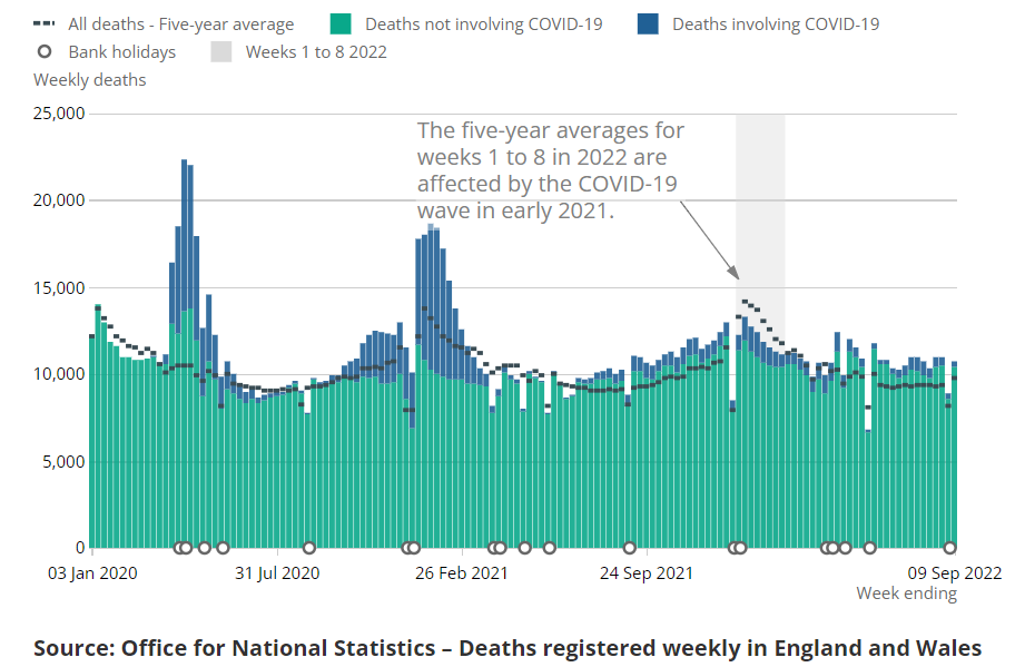 In the week ending September 9th, the most recent week for which data are available, 10,753 deaths were registered in England and Wales, which is 938 (9.6%) above the five-year average for the week. Of these, 365 mentioned COVID-19 on the death certificate as a contributory cause and 223 mentioned COVID-19 as underlying cause, leaving 715 deaths from a different underlying cause.