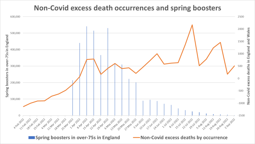Here are the excess non-Covid deaths by date of occurrence since February, plotted with the spring vaccine booster rollout figures owing to an apparent correlation, at least at the initial stages.
