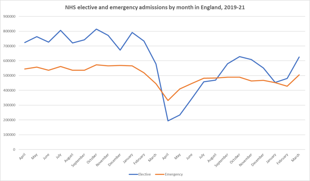 Could it be the lack of access to healthcare that’s causing the deaths, as suggested by Stuart McDonald? It can’t be helping, of course. But since heart problems (and more generally cardiovascular disease) are among the main causes, the central question is why more people are dying of CVD. Is this purely or mainly due to lack of access to treatment? This seems unlikely. It’s true that NHS elective and emergency admissions dipped considerably during 2020 and 2021, as shown below.