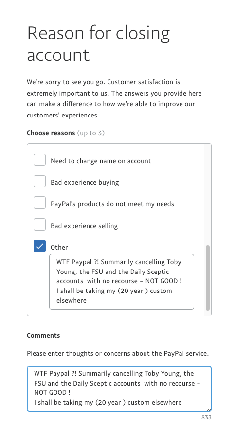 Closed my PayPal account (that I’ve had since 2004) and made a direct donation to Daily Sceptic using my credit card. Also lodged a complaint with PayPal. Note that the quickest way to complain is to select this option from the dropbox: “I don’t see my complaint reason”, as otherwise you’ll be taken through a maze of other rubbish. https://www.paypal.com/uk/smarthelp/complaints