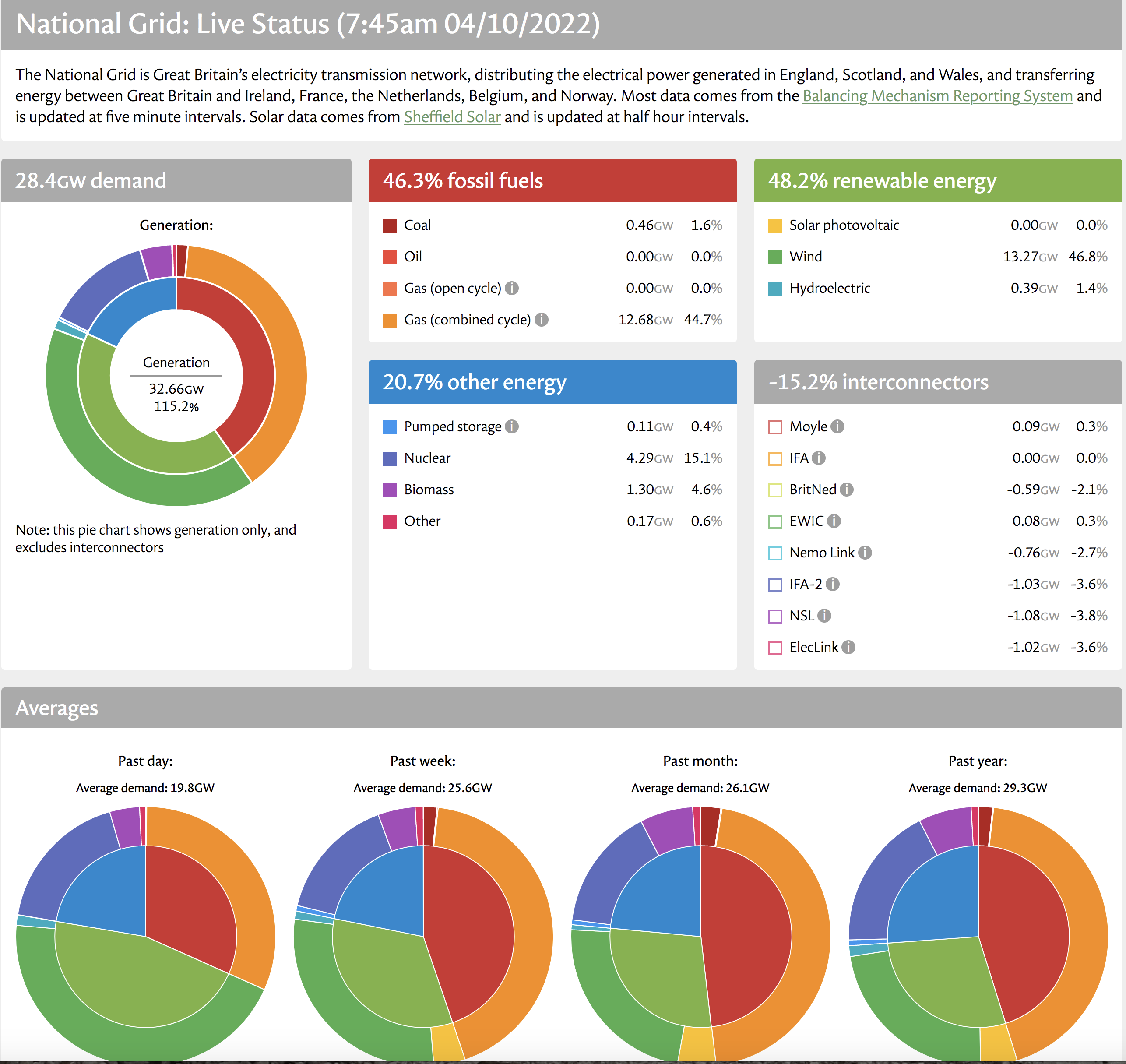 Note that it does not classify wood chips as “renewable” – it is called “Biomass” under “other energy”. Incidentally, at 7:45 about 15% of the generation was being exported from the UK grid to other places.