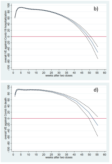 This implies that the vaccine effectiveness remained over 90% for nearly a year. This is very strange, as a study from Sweden using the same data but published in October 2021 found a sharp decline into negative territory by eight months.
