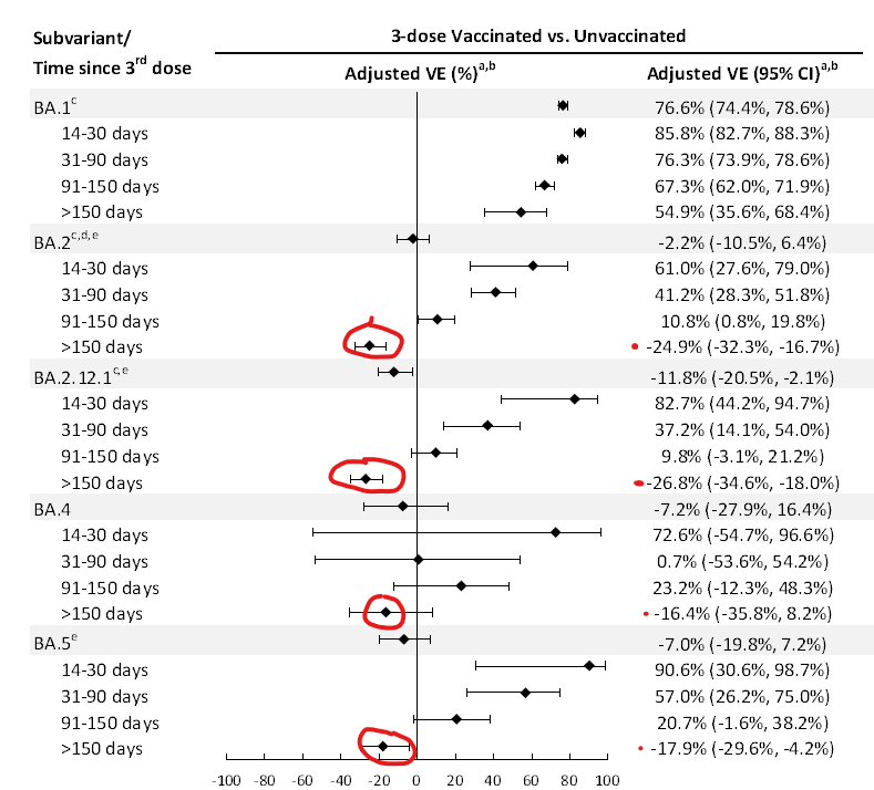The study found negative effectiveness (i.e., where the vaccinated have a higher infection rate than the unvaccinated) for three doses against all Omicron subvariants (BA.2, BA.2.12.1, BA.4 and BA.5) except BA.1, where the waning was slower.
