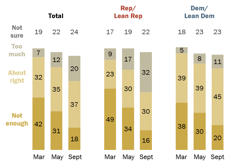 Back in May, Pew Research asked Americans whether the U.S. is providing too much or too little support to Ukraine. 42% said “too little”, and only 7% said “too much”. When they asked the same question in September, the percentages were 18% and 20%. (Though, of course, the U.S. did provide a lot of support in the interim.)