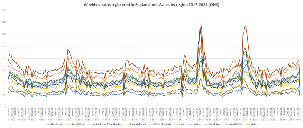 One suggestion is that the simultaneous surge of deaths across the regions of England in March 2020 is indicative of a cause other than an infectious virus. However, data from the ONS, displayed below, suggest that flu deaths typically surge across the country simultaneously, so this is not unusual or unexpected. While the data below are by registration date, which creates artificial synchronicity (e.g. from bank holidays – the sharp dips), nonetheless the regional patterns are so tight they leave no room to think the picture by date of occurrence would be vastly different.