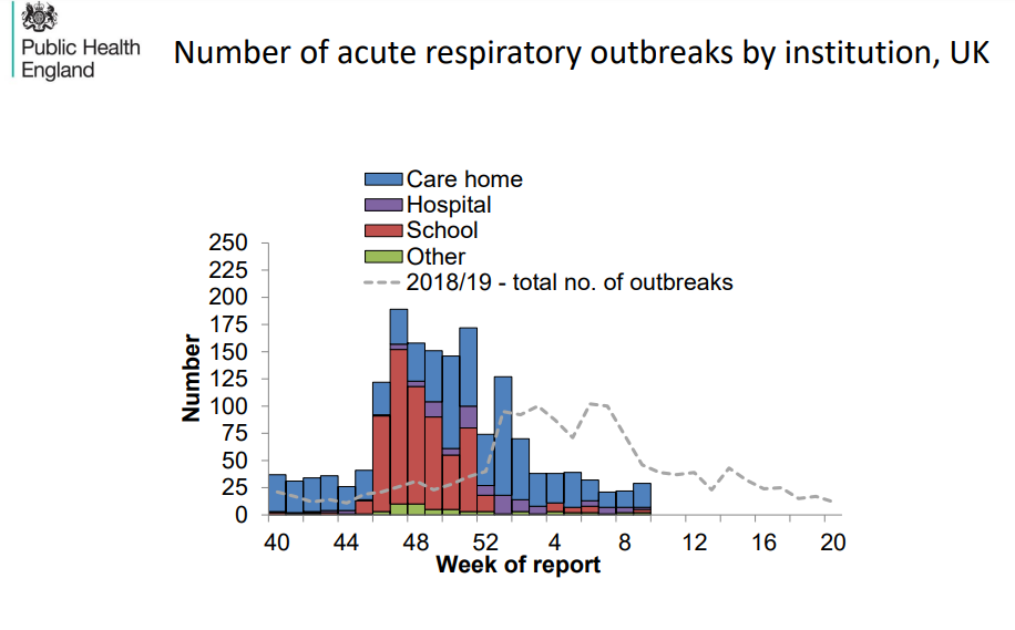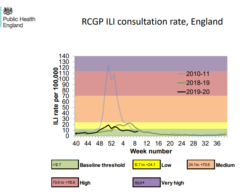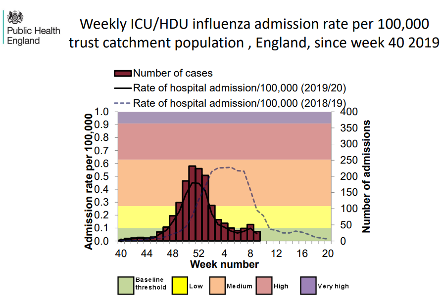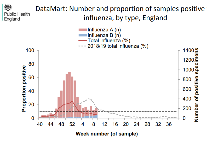 Take a look at these charts from the U.K. flu surveillance report in early March 2020. The flu season arrived early but it was not particularly severe.