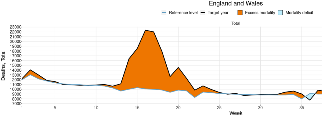 And here is England and Wales, with the unremarkable end of winter 2019-20 on the left hand side (before week 10). The contrast with the spring surge (and subsequent waves) is obvious.