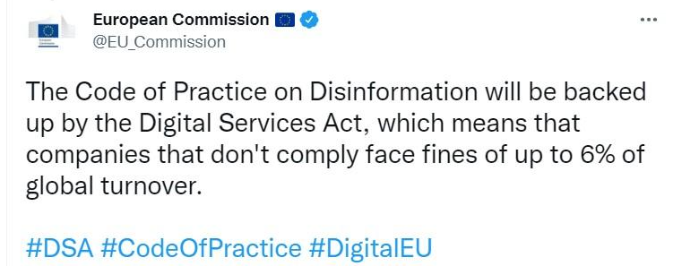 But with the passage of the DSA, the Code of Practice is evidently not so “voluntary” anymore. There is no need for complex legal analyses to show that the sanction provisions in the DSA are intended as the enforcement mechanism for the Code of Practice. The European Commission has said so itself – and in a tweet no less!