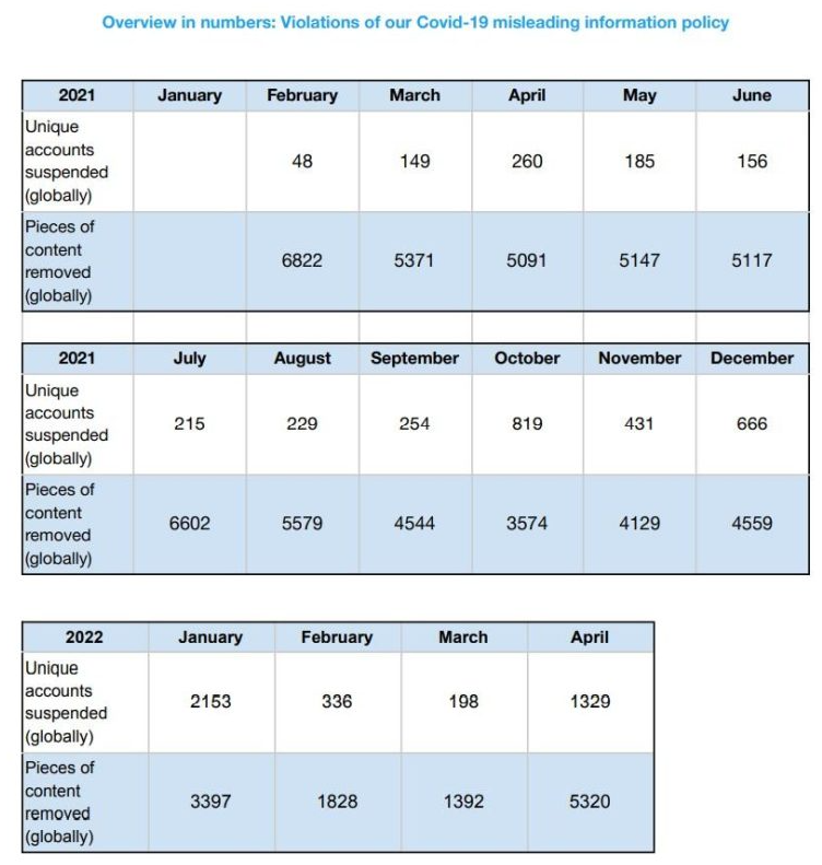 Twitter’s reports, for example, contain detailed statistics on Covid-related content removal and account suspensions. The below chart, showing the evolution of these numbers from February 2021 (shortly after vaccine rollout) through April 2022, is taken from Twitter’s latest available report from June of this year.