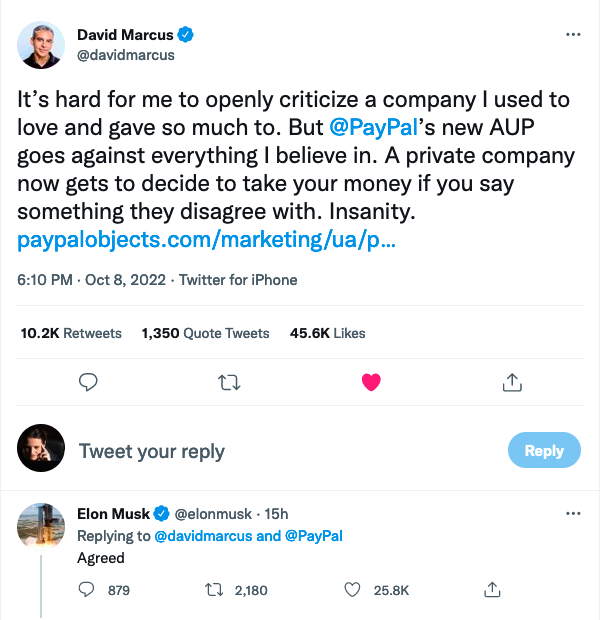 On Saturday evening U.K. time, PayPal’s former president David Marcus distanced himself very clearly from the action. Elon Musk, whose pathway to billionairehood started in 2000 when his company X.com was merged with Peter Thiel’s Confinity to create the PayPal of today, later tweeted that he agreed.