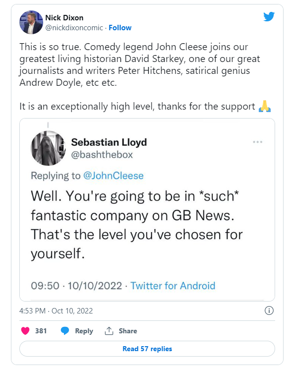 Ubiquitous Twitter Leftie and park serenader Femi expressed his disappointment that Cleese was now literally Hitler: “I just find it sad. I used to ADORE you. Your dark humour was era-defining. Your Hitler bit was hilarious BECAUSE you knew the audience understood the far right were the bad guys. Now you’re supporting a channel Andrew Neil left because even HE thought it was too far-right.”