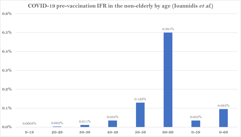 In the new study, which is currently undergoing peer-review, Prof. Ioannidis and colleagues found that across 31 national seroprevalence studies in the pre-vaccination era, the average (median) infection fatality rate of COVID-19 was estimated to be just 0.035% for people aged 0-59 years and 0.095% for those aged 0-69 years. A further breakdown by age group found that the average IFR was 0.0003% at 0-19 years, 0.003% at 20-29 years, 0.011% at 30-39 years, 0.035% at 40-49 years, 0.129% at 50-59 years, and 0.501% at 60-69 years.