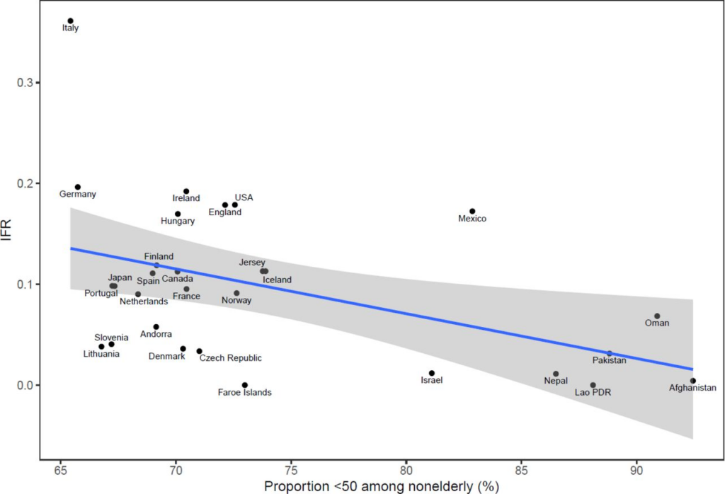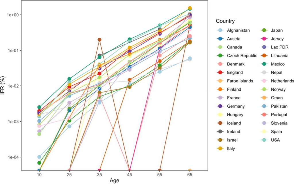 The reason some countries had much lower values and some much higher is not completely clear. The authors suggest that “much of the diversity in IFR across countries is explained by differences in age structure”, as per the plot below.