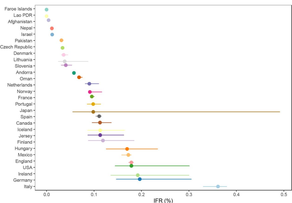 A breakdown by country reveals the wide range of IFR values across different populations.