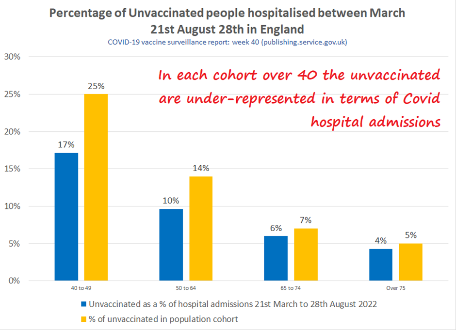 First, let’s just look at how effective spending £25bn injecting 150 million vaccines into the U.K. population has been. As the NHS continues to struggle to meet demand, perhaps Covid hospital admissions are the key metric. For the vaccine programme to have been a success we should expect the unvaccinated to be disproportionately admitted to hospital. They’re not. These figures come from the latest UKHSA Weekly Vaccine Surveillance Report; table 12a on page 49 gives us the figures for hospital admissions between March 21st and August 28th of this year. In each age cohort the unvaccinated are proportionately less likely to be hospitalised than the vaccinated. As an example, in the 50-64 year-olds, 129 of the 1,342 admissions were unvaccinated, that’s 9.6%. Yet, about 14% of that age group are unvaccinated. If the unvaccinated were more likely to be hospitalised we would expect the figures to be reversed, to see a higher proportion of the unvaccinated hospitalised than the total proportion of people unvaccinated.