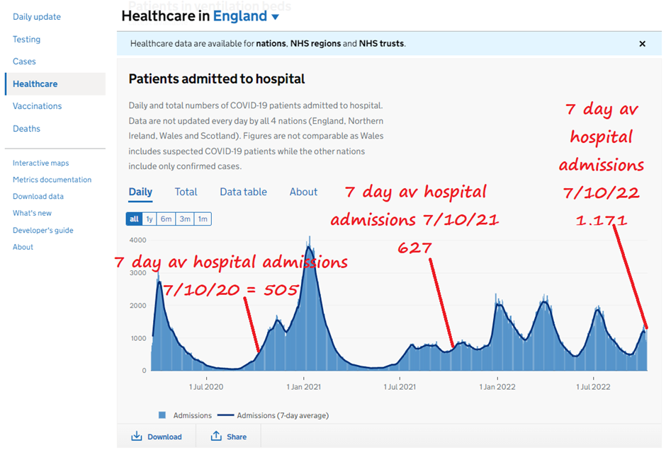 Also worth noting, the seven-day average number of hospital admissions for Covid is currently 132% higher than it was on October 7th 2020, before anyone anywhere had been vaccinated, and 86% higher than on October 7th 2021 when most people had been vaccinated – though it should be noted that over half of Covid hospital admissions since Omicron have been primarily being treated for something else.