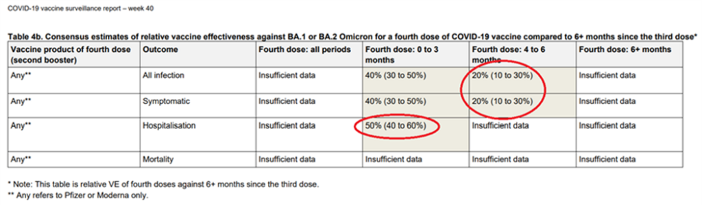 Despite my deep scepticism of the efficacy of the mRNA vaccines and the real world evidence presented above, to avoid any accusations of dogmatism I’m going to indulge the vaccine zealots’ figures for vaccine effectiveness. Again, with the data taken from the Government’s week 40 vaccine surveillance report, figure 3 suggests that the UKHSA thinks that the best protection a fourth dose of vaccine can offer is about 50%, soon falling to 20%.