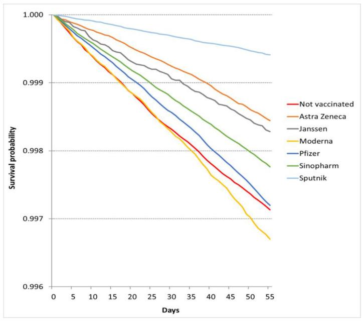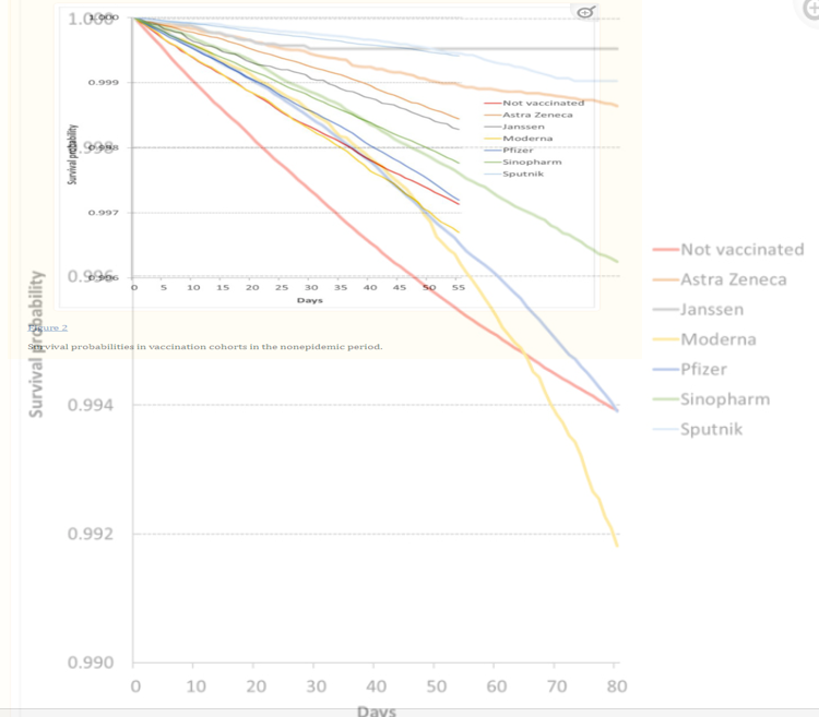 Below are two key charts showing the crude (unadjusted) survival rates in each cohort, depending on vaccine status or type. The top chart is for the non-epidemic period, so should show the normal background rate of deaths in each cohort, and the bottom one is for the epidemic period, so should show deaths elevated by the Covid wave.