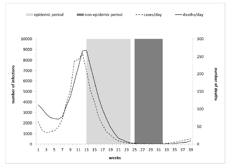 Further problems can be seen by superimposing the two charts on top of each other (noting the different scale on the axes) to allow easy comparison by eye of the mortality rates in the epidemic and non-epidemic periods.