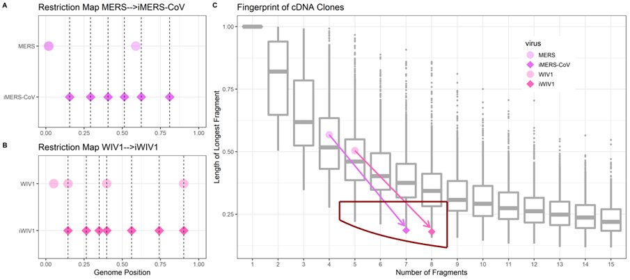 CoVs engineered to be infectious clones will move from having restriction maps falling within the wild type distribution to being outliers under the wild-type distribution, falling within the lab-ideal range of fragment number and low longest-fragment-length.