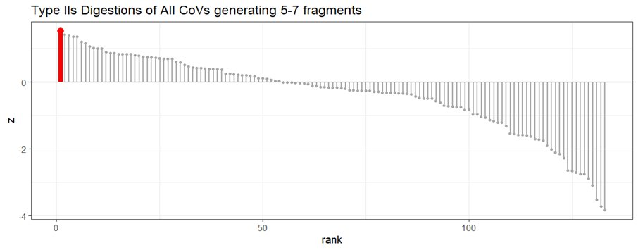 Digesting CoVs with only type IIS enzymes that could be used for assembly, SARS-CoV-2 is an even greater outlier. It’s in the bottom 1% max-fragment-length for all restriction enzymes. It’s the single largest outlier (<0.07%) of 1,491 type IIS digestions.