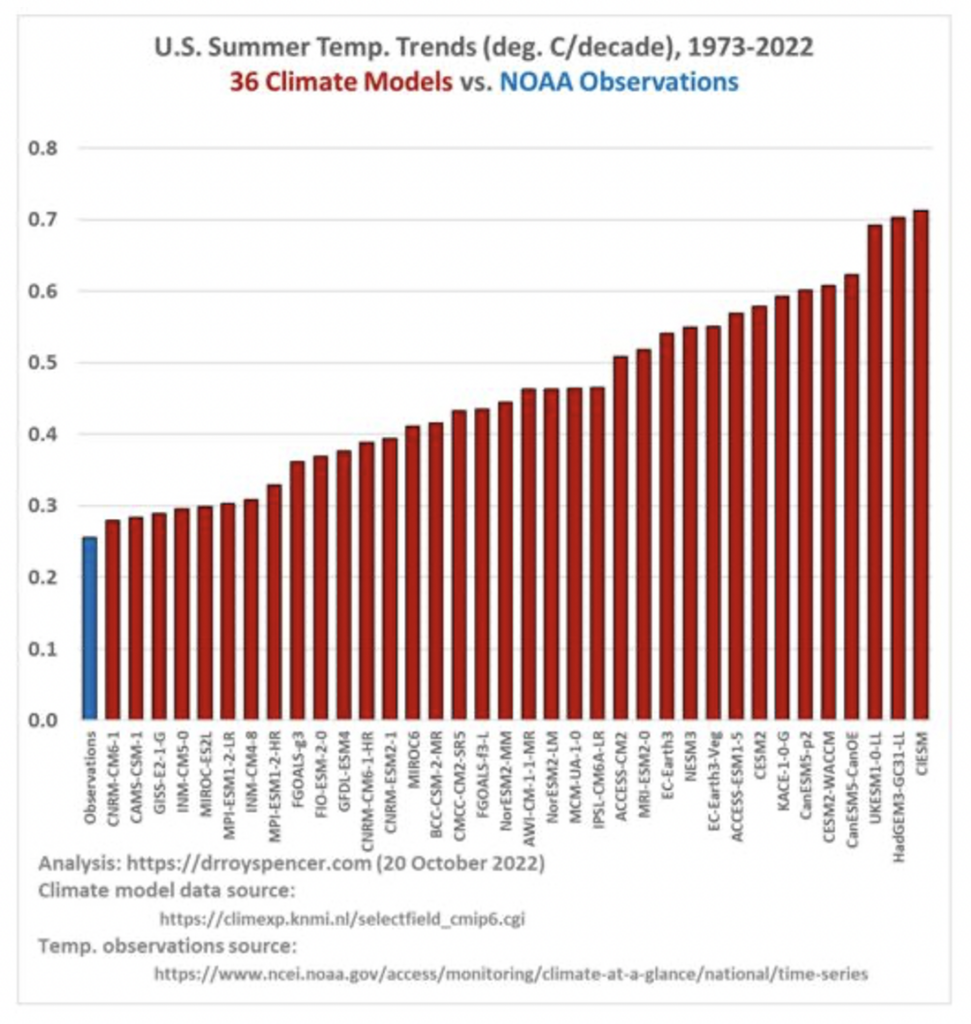 The Spencer work follows recent research published by Professor Nicola Scafetta of the University of Naples. He found that almost all the global temperature forecasts produced by models between 1980-2021 were excessive, some extremely so, compared with the accurate satellite record. One of the reasons given as to why there’s no climate emergency in the World Climate Declaration is that climate models are “not remotely plausible as global tools”.