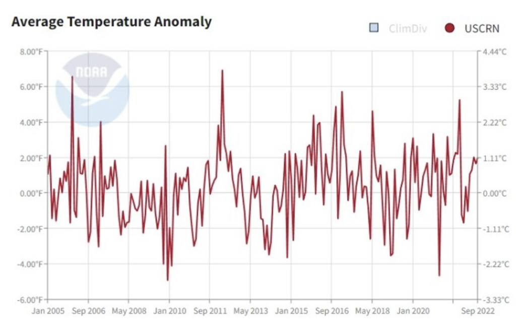 There is further substantial evidence that NOAA’s U.S. surface temperature figures are too high. In 2005, it started compiling data from a select group of 114 stations across the country that had been specifically sited away from urban development. Called the U.S. Climate Reference Network (USCRN), it was intended to aim for “superior accuracy and continuity in places that land use will not likely impact during the next five decades”.