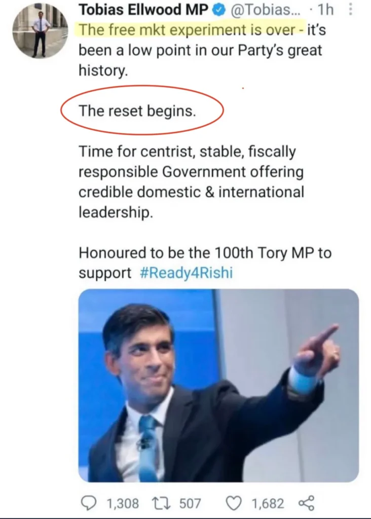 Tobias Ellwood MP was an early Rishi supporter announcing that “the free market experiment is over and the reset begins” before swiftly deleting his tweet.