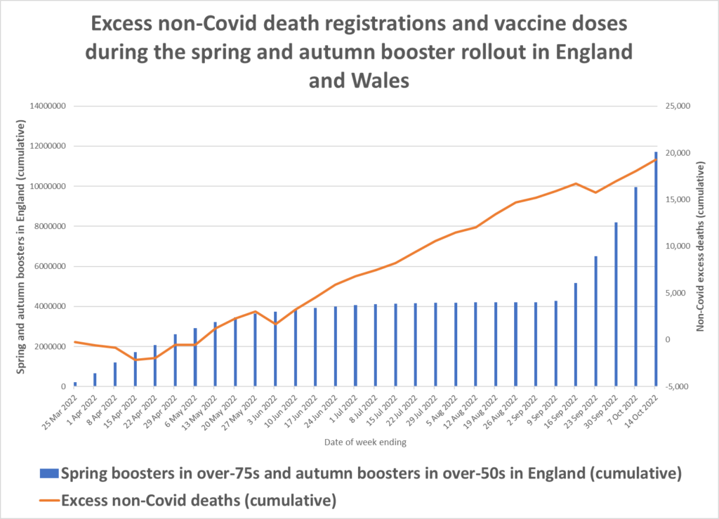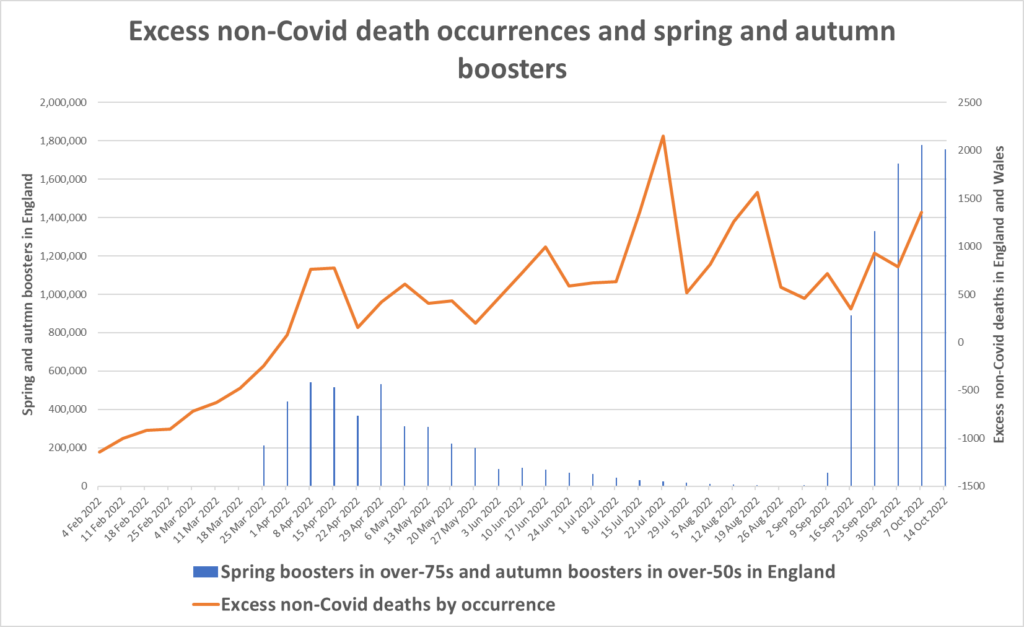 The autumn booster campaign in over-50s in England does correlate somewhat with a new rise in excess non-Covid deaths, as shown below. It will be interesting to see how this develops. I discuss potential explanations for the excess deaths and possible connections with the vaccines and virus in my previous post.