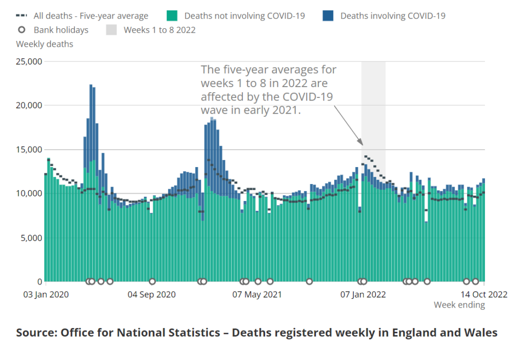 In the week ending October 14th, the most recent week for which data are available, 11,699 deaths were registered in England and Wales, which is 1,608 (15.9%) above the five-year average for the week. Of these, 565 mentioned COVID-19 on the death certificate as a contributory cause and 374 mentioned COVID-19 as underlying cause, leaving 1,234 deaths from a different underlying cause.
