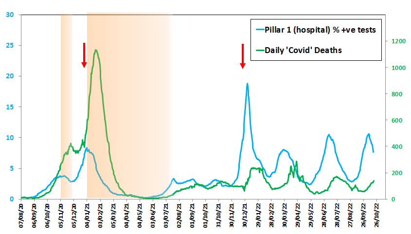 Pillar 1 screening of hospital patients has given a largely consistent picture since after the first wave (during which it was less reliable as it was still being set up). Pillar 1 data reflect infections in older groups, which is where Covid has any significant health risk (similar to flu). Comparing death rate to Pillar 1 positivity shows how the infection fatality rate fell dramatically with Delta versus Alpha and earlier variants (the blue and green lines are closer together, vaccines and natural immunity may have played a role here), with a further decrease with Omicron.