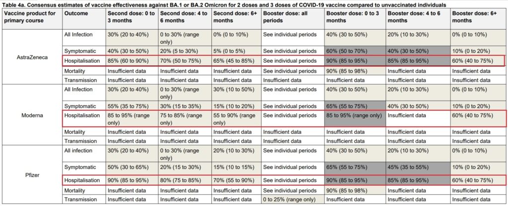 Figure 5 shows the claimed efficacy for the various vaccines following various doses taken from the UKHSA’s week 40 (the latest) vaccine surveillance report (page 14). I’ve put a red box around the hospital admission rates.