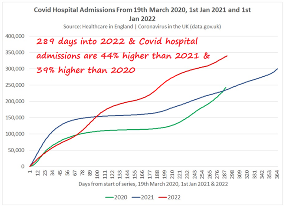 There have been 39% more Covid hospital admissions in the first 289 days of 2022 than there were in the 289 days from March 19th 2020 to the end of December 2020.
